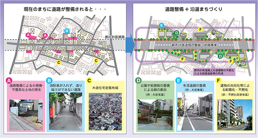 特に木造住宅密集地域においては、道路整備と連携した建物の共同化などによる沿道の不燃化により、延焼遮断帯の形成と防災機能の向上を図るため、以下のような取組みを行っています。