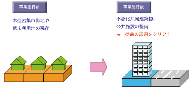 都市再開発法に基づき、市街地の土地の合理的かつ健全な高度利用と都市機能の更新とを図ることを目的に、建築物、建築敷地の整備及び公共施設の整備を行う事業です。