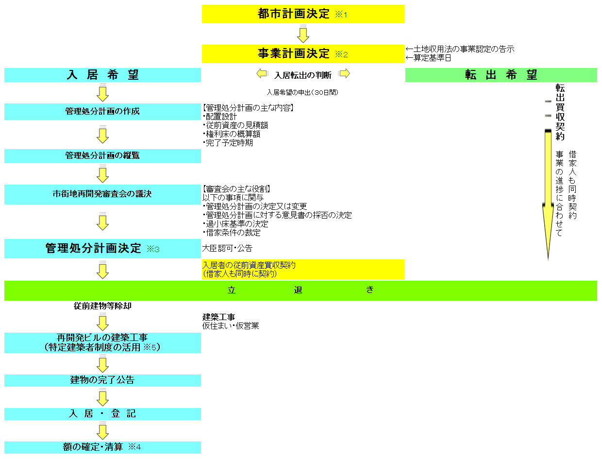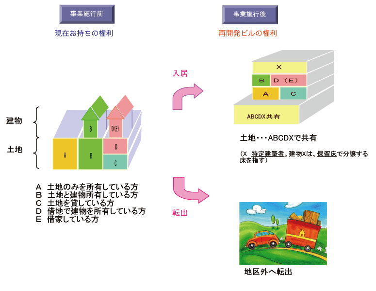 市街地再開発事業では、今まで所有・使用していた土地や建物等の権利を、新しく建てる建物の床に置き換えます(権利床)。地区内の権利者(居住者を含む)は入居する、しないを選択することができます。入居しない場合は、従前の土地・建物などの補償を受けて、事業区域外へ転出します。(下図を参照)