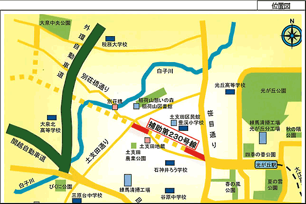平成25年11月15日、補助第230号線(土支田・高松地区)の全線を交通開放しました。笹目通りから土支田通りまでつながり、地区の主要路線として、交通の利便性、安全性が向上し、地区全体のさらなる活性化に貢献します。