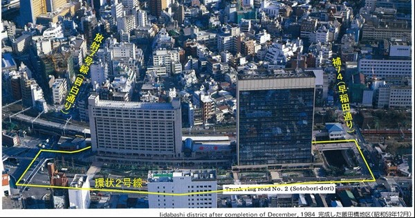 飯田橋地区はJR中央線「飯田橋」駅の北側に接し、外濠通り、早稲田通り、目白通りに囲まれた旧「飯田濠」を中心とした地区です。濠の汚濁、悪臭の環境改善を図るために埋め立てて暗渠化し、その上部に建築物を建てるという独特な再開発地区です。
