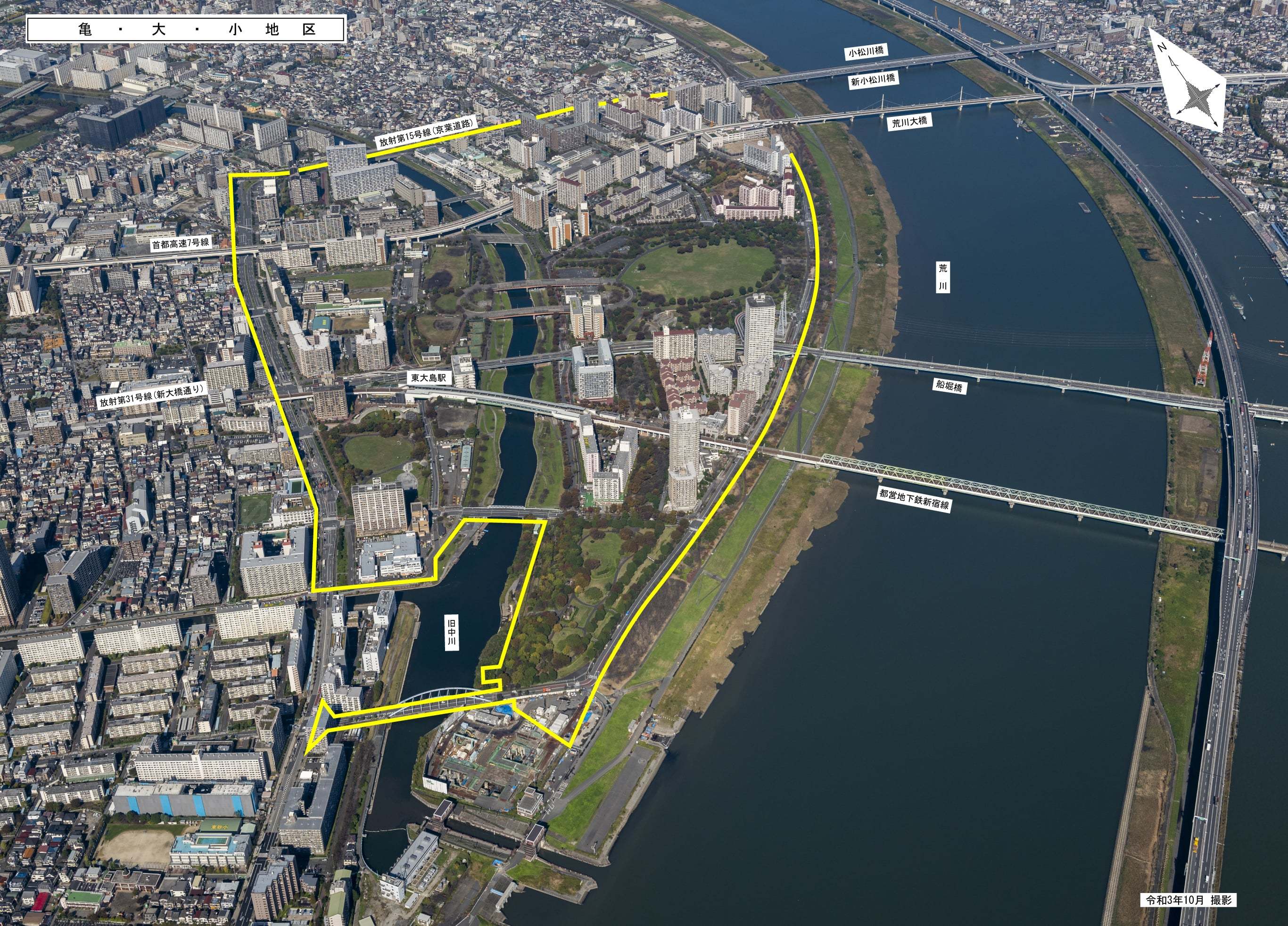 亀戸・大島・小松川地区は、荒川・京葉道路(放射第15号線)及び新六ノ橋通り(補助第144号線)に囲まれた、約114haの地域です。 このうち、約98.6ha(防災拠点外0.2ha含む)が市街地再開発事業の施行区域となっています。