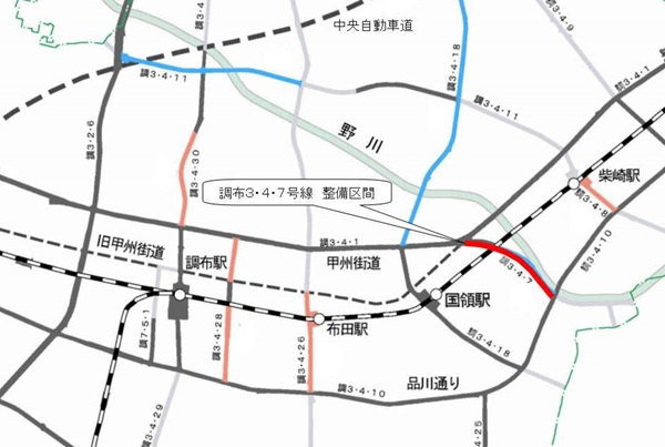 当事務所では、国領地区の都営住宅金子町アパートの建替えを契機として、都市計画道路調布3・4・7号線の甲州街道から品川通りまでの区間(約580m)について、街路事業認可を取得し事業を進めております。