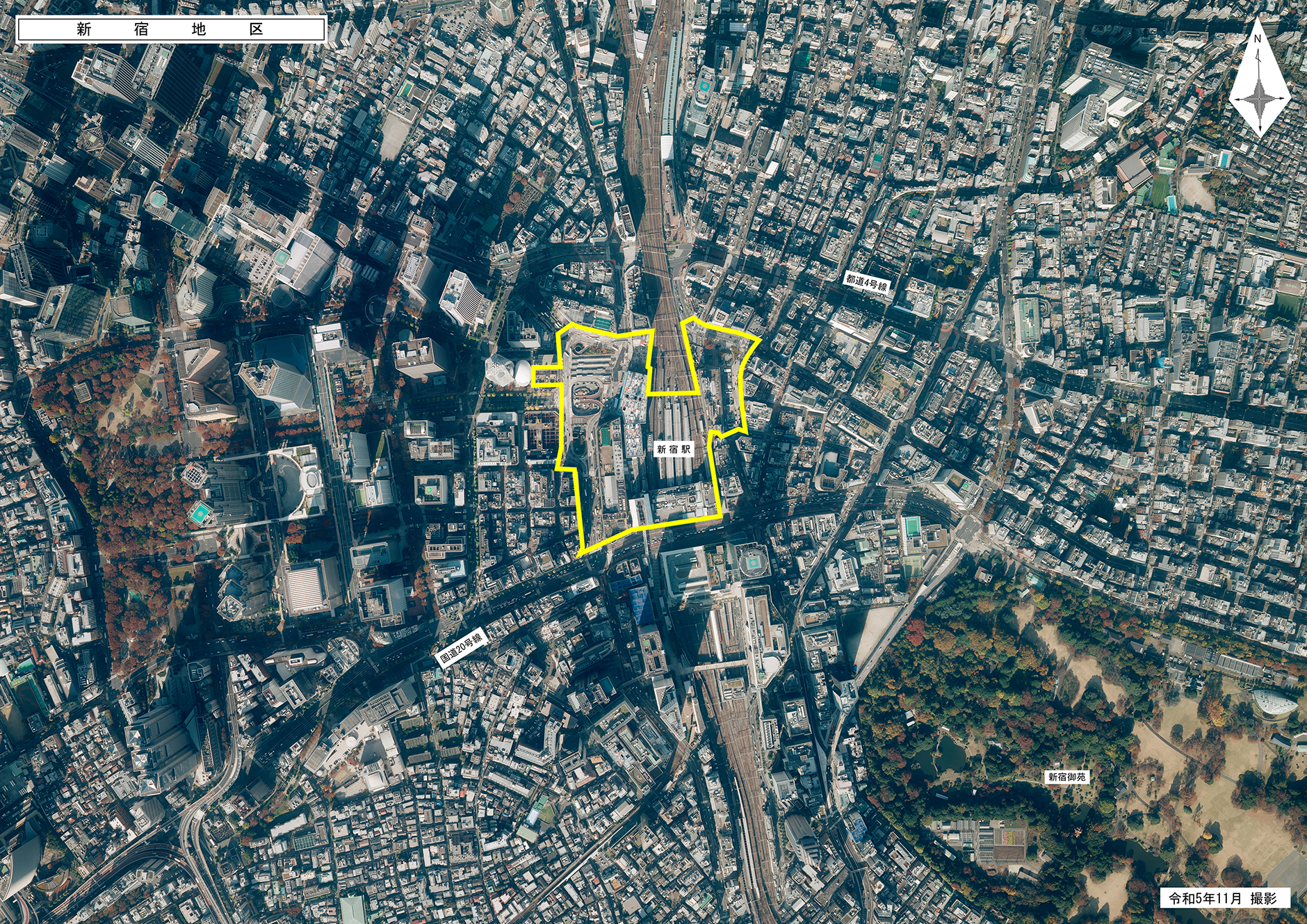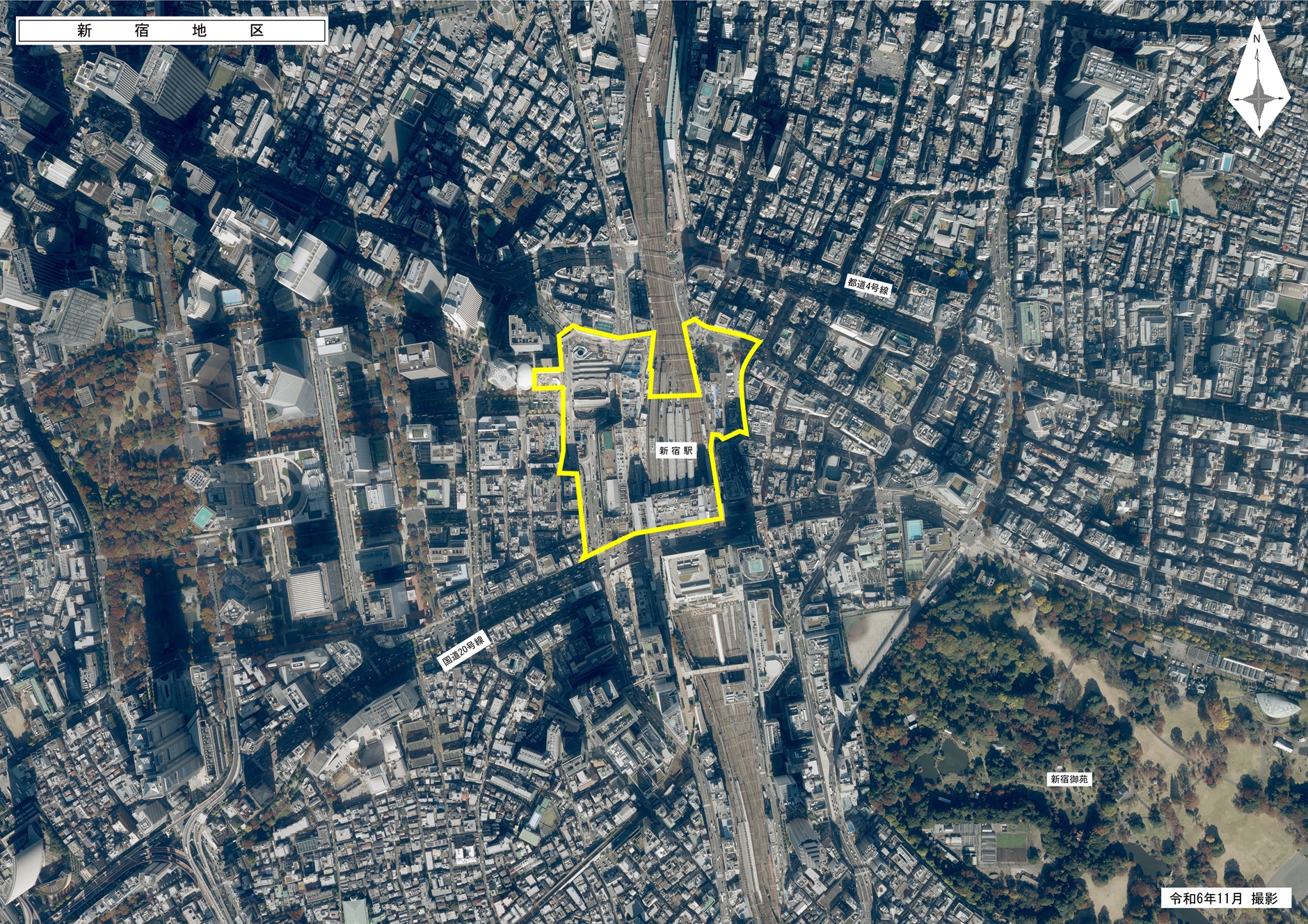都と新宿区が策定した「新宿の拠点再整備方針(平成30年3月)」では、線路上空にデッキを新設することや駅前広場を人中心に再構成すること、駅の改良や駅ビルの機能更新を進めることなどにより、「新宿グランドターミナル」として再編していくこととしています。