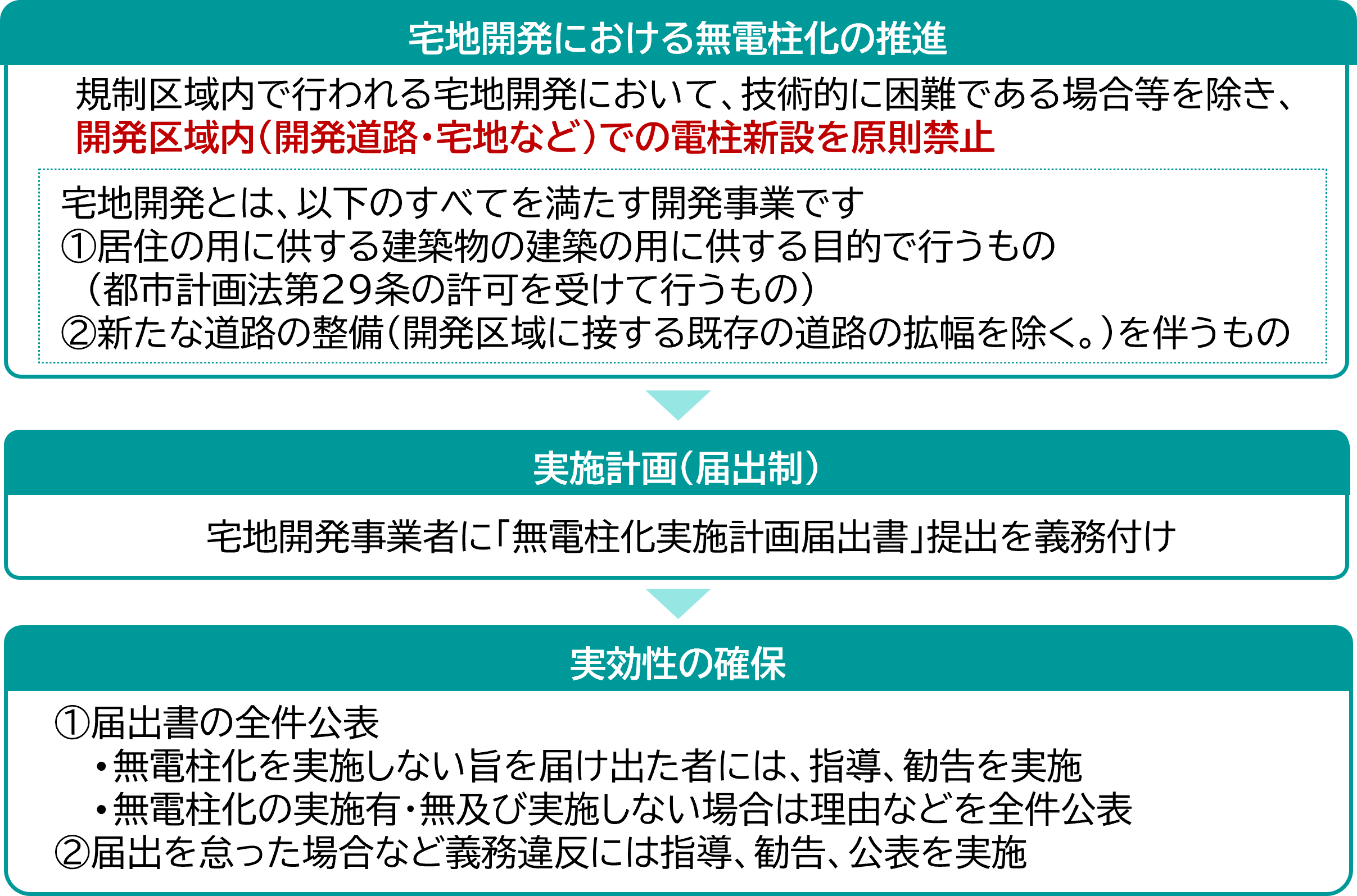 - 東京都は、無電柱化法を踏まえ、規制区域内で行われる宅地開発について開発区域内への電柱等の新設を原則禁止とする条例を令和8年3月に制定しました。