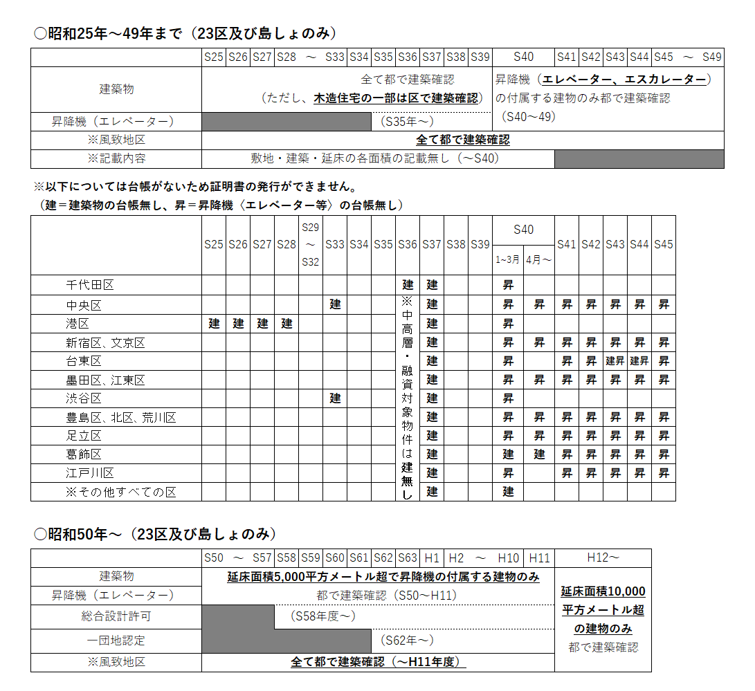 建築確認は、年代や規模などの条件によって、東京都で確認しているものと区で確認しているものがあるため、東京都の建築指導課で発行可能な建築物の台帳については、23区及び島しょに関する以下のものに限られますので、あらかじめご確認ください。