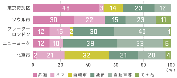 東京の鉄道は、海外諸都市と比較すると路線密度や鉄道ネットワーク形成の面で相当程度整備が進んでいます。また、さまざまな移動手段のなかでも鉄道を利用する人の割合は高く、その役割は非常に大きいといえます。