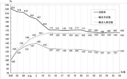 鉄道の混雑率は、昭和40年以降一貫して低下しており、近年では主要路線の平均混雑率は165%まで改善しています。しかし、通勤・通学の所要時間は近年、徐々に増加しており、サービス水準としては未だ不十分であること、鉄道相互の乗り継ぎが不便になっていること等の諸課題があり、これらの解決が求められています。