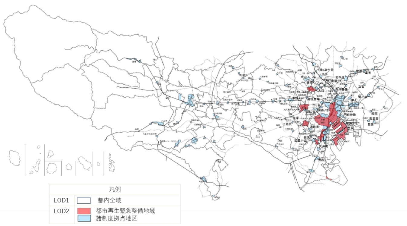 「都市の3Dデジタルマップの実装に向けた産学官ワーキンググループ」で検討された要件定義書・製品仕様書に基づき、3Dデジタルマップの整備を行っており、都内全域で基礎的な社会的共通資本として社会的厚生の公平性・公正性確保の観点から、LOD1として整備・更新するとともに、都市機能の高度な集積等が進む「都市再生緊急整備地域」や「都市開発諸制度拠点地区」を対象に重点エリアを設定し、「エリアLOD2」として整備を進めています。